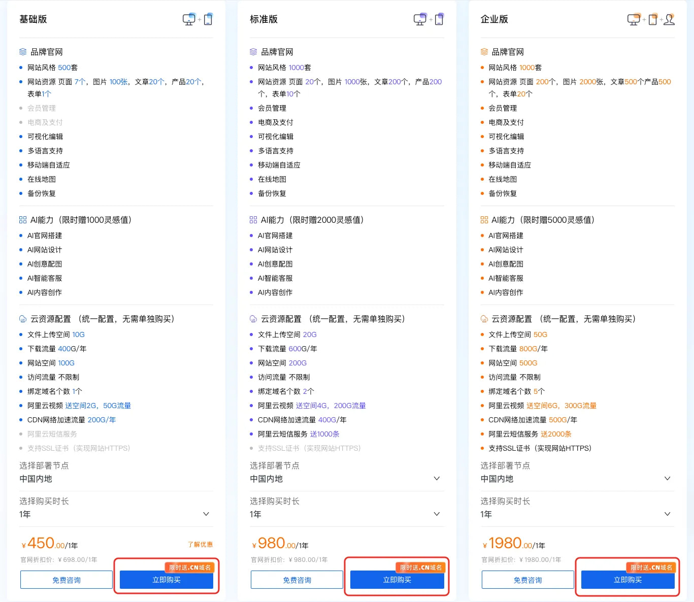 2)每个建站订单,对应1个.CN域名首年免费权益;